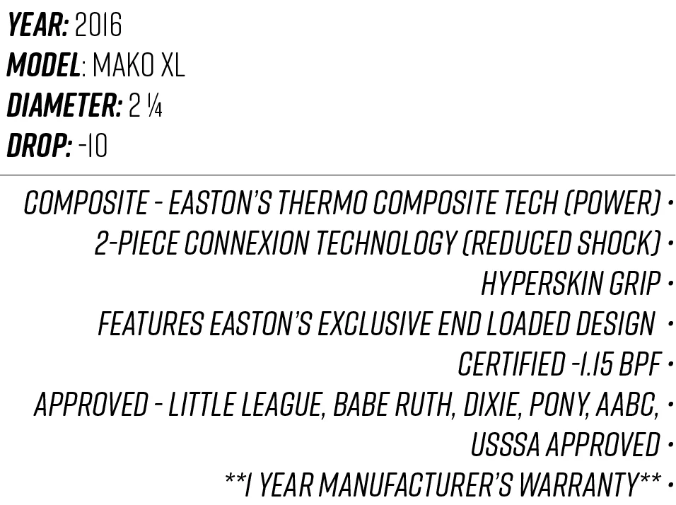 SUMMARY: The 2016 Mako XL utilizes many of the advanced technological features found in a standard Mako except for the end loaded barrel. The XL edition encompasses an end loaded variation designed to provide an unmatched level of pop for hitters that can handle an off balance weight distribution. Similar to the standard Mako, the Mako XL utilizes Easton’s TCT™ Thermo Composite Technology. This specialized innovation offers hitters increased bat speed, stronger durability, and an enlarged sweet spot which significantly intensifies the trampoline effect on the baseball. This bat also incorporates Easton’s patented Two-Piece ConneXion that applies a special hinge technology to the barrel and handle keeping them attached without touching. This design maximizes energy transfer while simultaneously eliminating any shockwave vibrations to the hitter’s hands. As mentioned earlier, the main difference between the Mako XL and a standard Mako is the end loaded barrel. The XL carries an uneven distribution of weight placing more weight in the sweet spot region which delivers additional pop. Alternatively, a standard Mako provides a balanced weight distribution throughout the entire length of the bat making it much easier to achieve a fluid level swing.