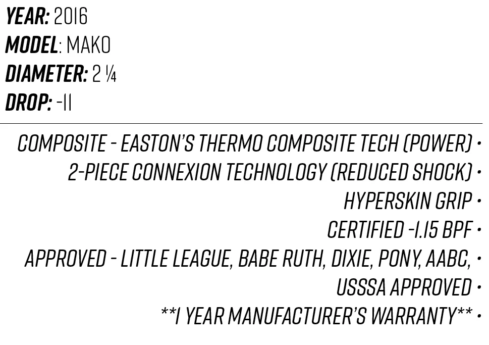 SUMMARY: The 2016 Easton Mako features a multitude technological advancements geared towards maximizing offensive productivity and overall comfort for the hitter. The most significant aspect of these Makos is undoubtedly the patented TCT™ Thermo Composite Technology. Every Mako bat is comprised with this formulated material which produces quicker swing speeds, an enlarged sweet spot, and a more impactful collision with the ball. The 2016 Mako also showcases Easton’s Two-Piece ConneXion which utilizes a special hinge between the barrel and handle keeping them separated yet securely connected. This allows for max energy transfer and the elimination of irritating shock vibrations to the hitter’s hands.