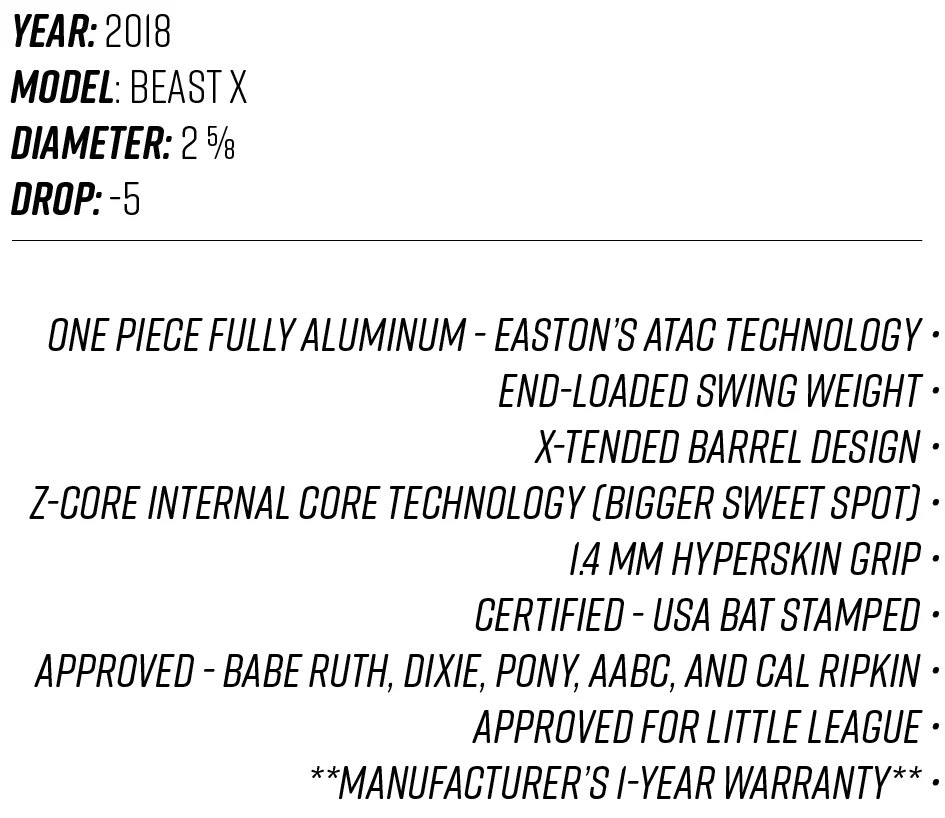 SUMMARY: The 2018 Beast X -5 drop youth baseball bat features all the same innovative Easton technological enhancements found in the Beast X -10 drop but with one major variance. Similar to the 2018 Beast X -8, The Beast X -5 drop encompasses Easton’s end loaded swing weight which sacrifices some balance for added power. The 2 5/8 barrel houses Easton’s X-tended barrel design and Z-CORE internal core technology giving youth hitters an enlarged sweet spot and the longest barrel in youth baseball. The entire youth bat is composed of a single piece aluminum construction featuring Easton’s Advanced Thermal Alloy Construction (ATAC) which applies an unmatched sound and explosive energy upon the baseball. The ATAC handle comes with Easton’s 1.4mm HYPERSKIN grip distributing supreme comfort and a natural feel when stepping to the plate. The 2018 Easton Beast X -5 drop is perfect for youth ball players who demonstrate above average hitting abilities being able to handle an end loaded unbalanced swing weight that carries more aluminum material within the sweet spot region. If your ball player is seeking an alloy youth bat a bit on the heavier side and geared more towards enhancing power over speed, the Beast X -5 drop is perfect.